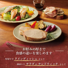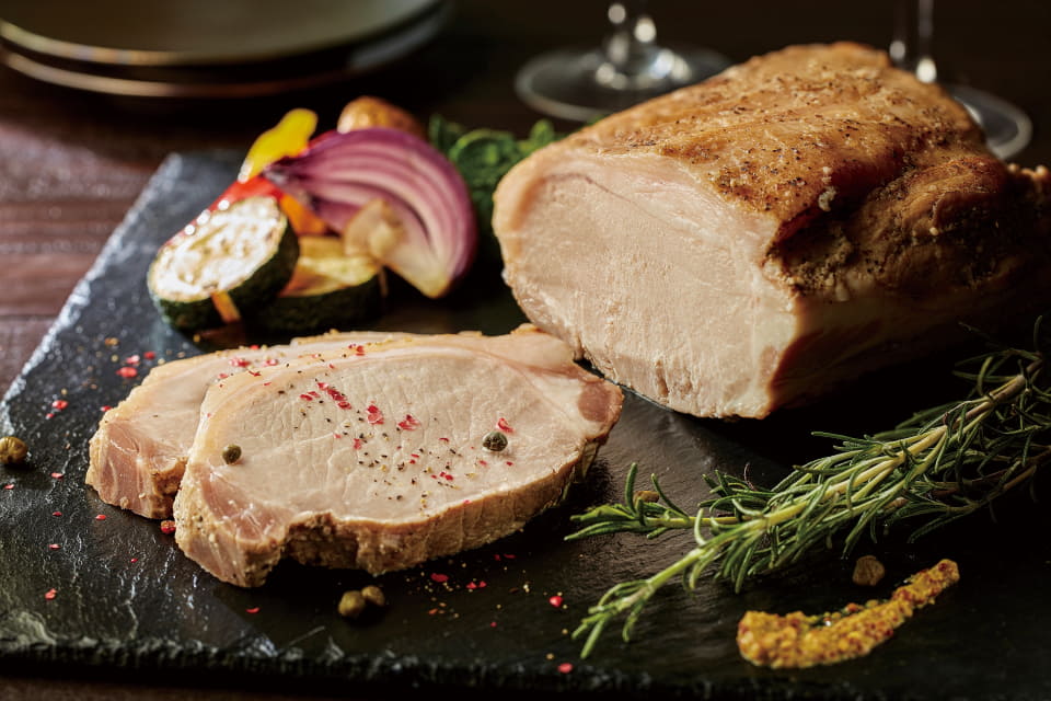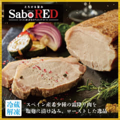 脂が溶ける融点が32℃と低く“とろける旨み”と深いコクが特徴の、生ハム用として流通する希少なスペイン産純粋デュロックポークの「SaboRED」を塩麹に漬け込み、じっくりとローストした。前日に冷蔵庫で解凍し、好みの厚さにスライスするだけで、前菜からメインディッシュまで楽しめる。