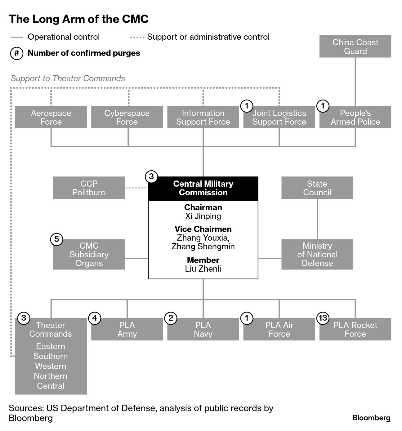 今回の更迭は、習氏が政権を握って以来、1日で実施された最大規模の軍幹部粛清となった。ブルームバーグの集計によると、習氏の下で登用された79人のうち少なくとも14人がすでに公式に解任されており、この中には国防相を務めた魏鳳和、李尚福両氏も含まれている。