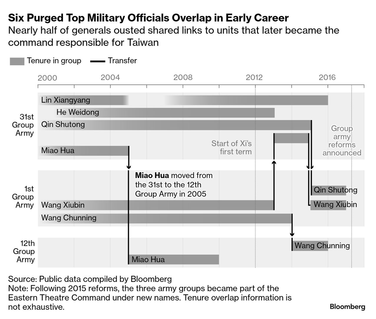 70年代から2000年代初頭にかけて、何氏と苗氏はいずれも福建省アモイに駐留する第31集団軍に所属していた。台湾に面する中国東部の福建省は、習氏の政治経歴の出発点で、習氏はその時期の知り合った何人もの党員を要職に登用してきたとされる。苗、何両氏もそうした流れで昇進したとみられていたが、最近の失脚で地位を失った。