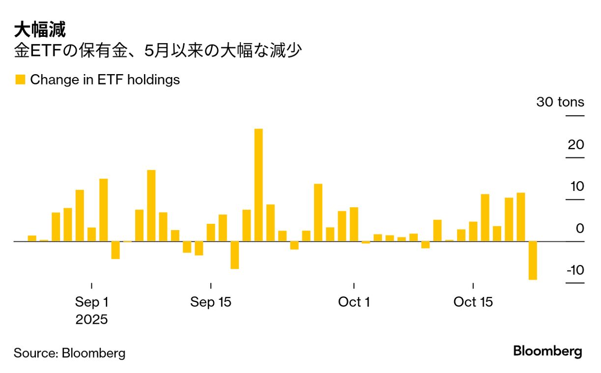 金価格の下落は、金に連動する上場投資信託(ETF)が保有する金の大幅な減少と重なった。ブルームバーグがまとめたデータによれば、22日の保有金の減少量は過去5カ月で最大となった。