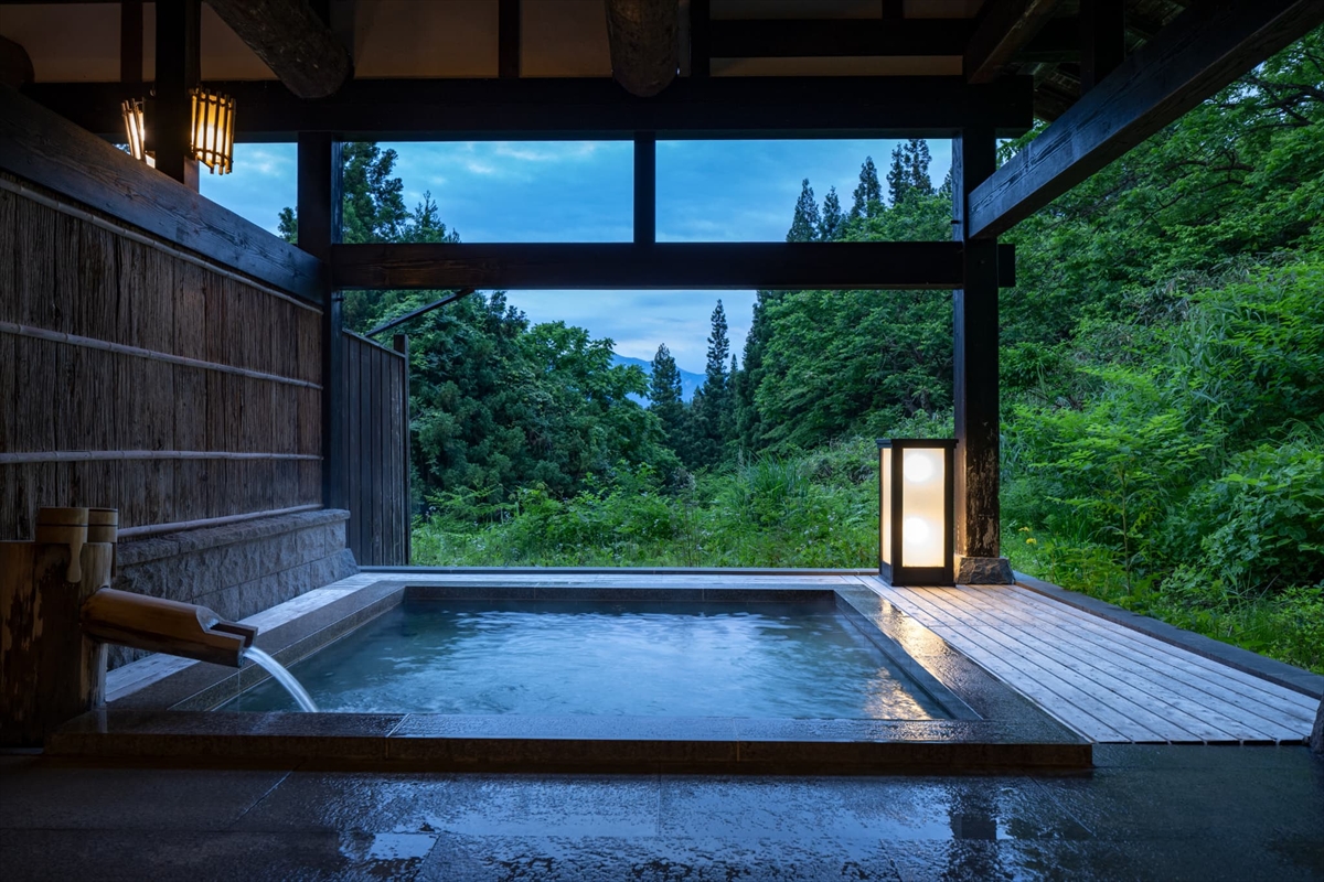 山々に囲まれた露天風呂は、夜は貸切風呂、朝は男女入れ替え制で利用できるようになりました。眼前には百名山・巻機山(まきはたやま)を望み、季節ごとに表情を変える大自然を満喫できます。