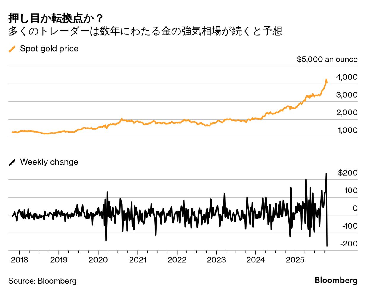 こうした警告は現実のものとなった。金価格は21日に一時6.3%下落し、2013年以来の大幅安を記録。24日まで下げを引きずり、1オンス=4113.05ドルで週を終えた。週間での下げ幅は138.77ドルと、過去最大級の落ち込みとなった。