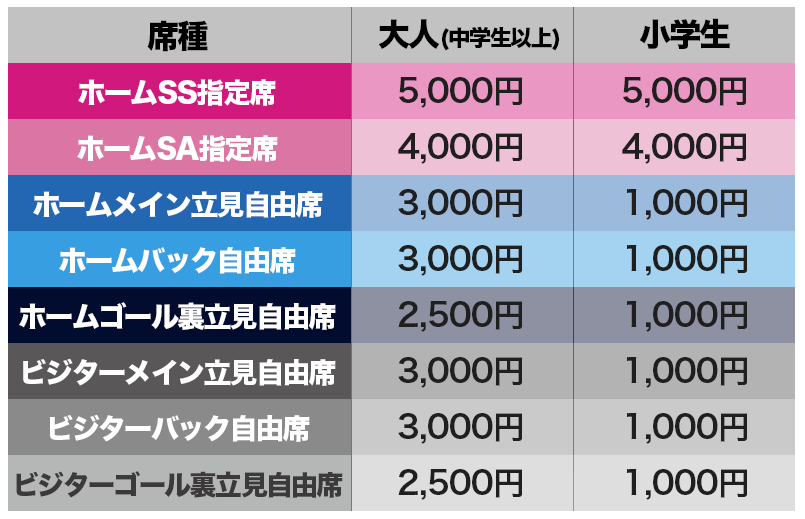 ※「ホームメイン立見自由席」「ホームゴール裏立見自由席」「ビジターメイン立見自由席」「ビジターゴール裏立見自由席」は立ち見席となります。