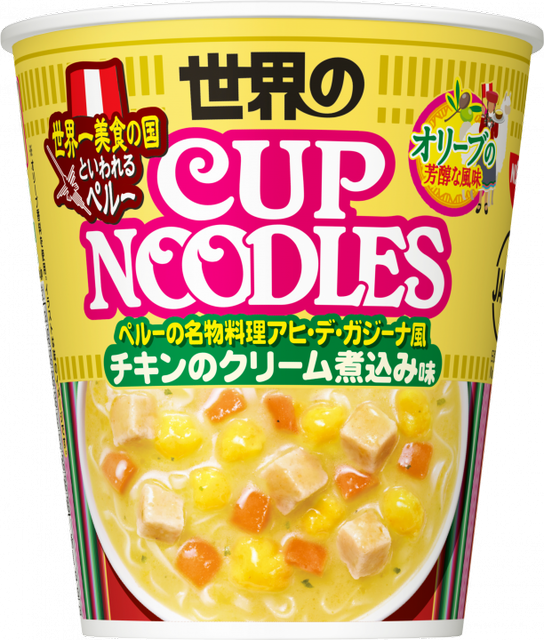 今回、“アヒ・デ・ガジーナ”を「カップヌードル」流にアレンジした「カップヌードル ペルー式チキンのクリーム煮込み味」が登場します。チキンのうまみを濃縮したクリーミーなスープに、ニンニクやパプリカなどを加えることで、濃厚かつパンチのある一杯に仕上げられています。黄色唐辛子とオリーブの芳醇な風味(黄色唐辛子香料およびオリーブ香料を使用)がアクセントとなり、エキゾチックな味わいが際立つとのこと。