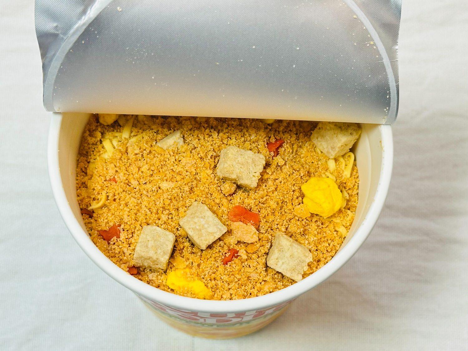 熱湯を入れ3分待ち、再びフタを開けたところです。全体的に黄色い印象ですが、一見すると普通のカップヌードルのように見えます。