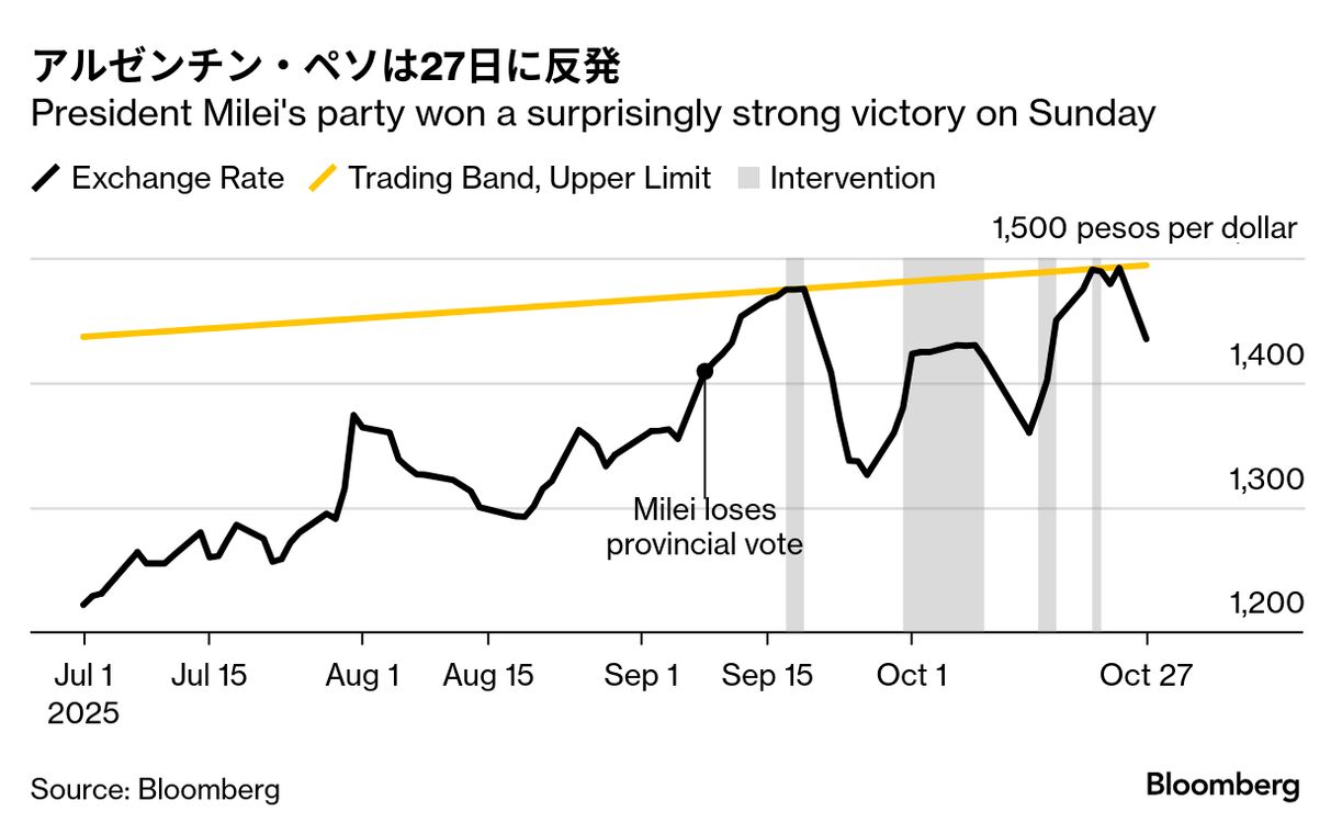 アルゼンチンのミレイ大統領率いる与党が26日の議会中間選挙で予想外の圧勝を収め、アルゼンチン・ペソは反発した。トランプ米大統領は、米国がアルゼンチンを支援することで「多額の利益」を得たと述べたが、実際の成果は、明らかにもっと限定的だったようだ。