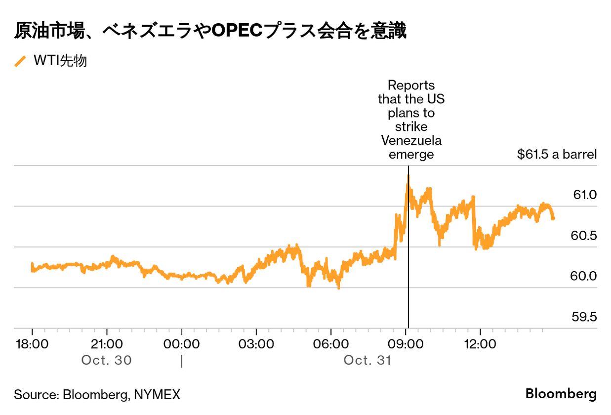 ウェスト・テキサス・インターミディエート(WTI)先物は、朝方には大きく上昇する場面もあった。米国がベネズエラの軍事施設を含む標的への攻撃を計画しているとの報道に反応した。トランプ氏はその後、そのような攻撃は検討していないとして、報道を否定した。
