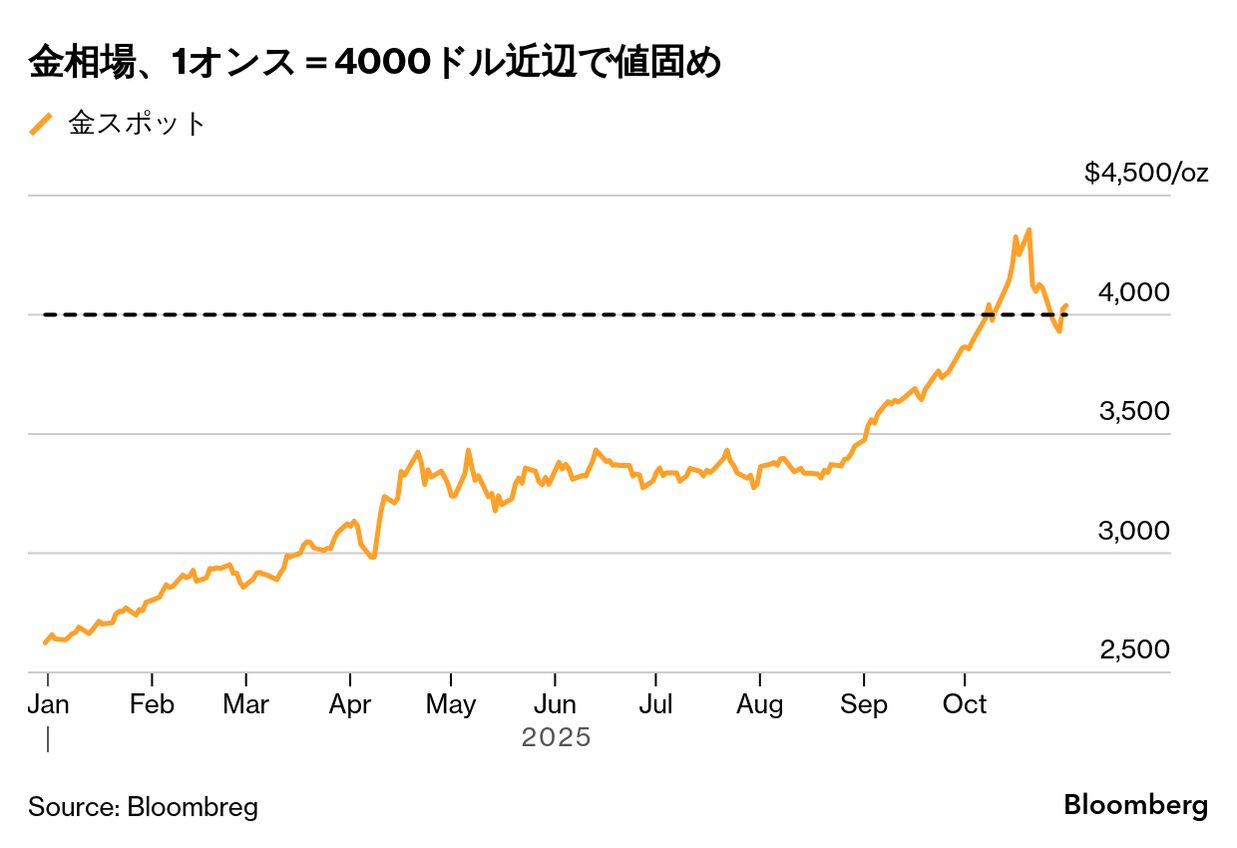 金スポット相場はニューヨーク時間午後2時45現在、前日比21.18ドル(0.5%)安の1オンス=4003.36ドル。ニューヨーク商品取引所(COMEX)の金先物12月限は19.40ドル(0.5%)安の3996.50ドルで引けた。