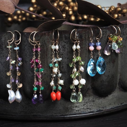 小さく束ねられた宝石が自然に揺れる様は、木の実や花を思わせる愛らしさがあり、宝石そのものの表情を楽しめるコレクションとなっております。“シャンク巻き”と呼ばれる金線をひねり留める技法を用い、職人が一つひとつ丁寧に繋いで仕立てています。宝石とチェーンで構成された繊細なデザインでありながら、ジュエリーとしての強度、地金の贅沢感も感じていただけるように、フックの形にもこだわり、オリジナルでおつくりしております。