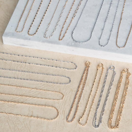 ネックレスは45cm・50cm・60cmの3サイズ、ブレスレットは16cmでご用意しております。長さやデザインによって雰囲気が変わるため、店頭でさまざまにお試しいただきながら、お気に入りの組み合わせを見つけてください。
