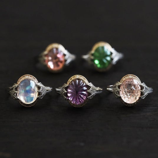 今月の誕生石であるシトリンは、菊の花を思わせる繊細なカーヴィングが施されたものも登場。