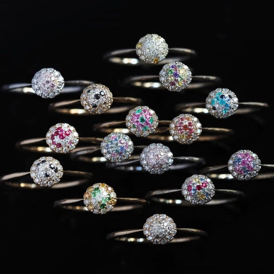 PARCELLE JEWELRYのパヴェは、単なる石留めではなく、地金の余白までも計算された精緻な職人技の結晶。17石のダイヤモンドとカラーストーンを一石ずつ隙間なく敷き詰め、光の粒が重なり合って生まれる奥行きと、微妙な濃淡が織りなす色彩のハーモニーを生み出しています。小ぶりながらも確かな存在感を放ち、他のリングと重ねても美しく調和するバランスに仕立てました。