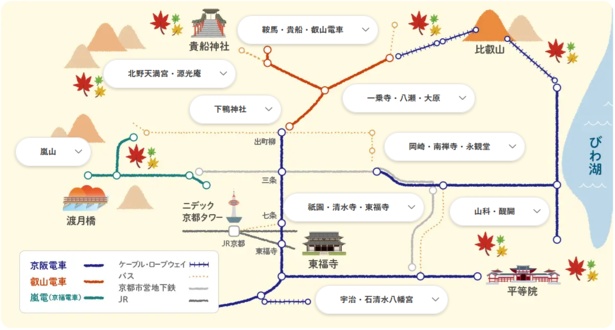 「京都・滋賀 京阪沿線の紅葉特集 2025」にはエリアごとの名所を合わせた路線図を掲載(画像は2024年のもの)画像提供:京阪電車