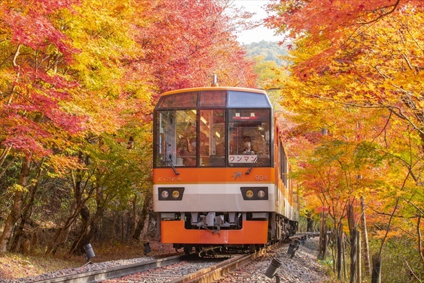 叡山電車鞍馬線の市原駅から二ノ瀬駅間の約250メートルの区間は「もみじのトンネル」と呼ばれ、約280本ものイロハモミジ、オオモミジの葉が電車を囲むように広がる。早い時期なら黄、橙、紅、見頃の終盤には真紅に染まった色彩美を作り出す。列車の中からしか見ることができないもみじのトンネルは、鉄道旅ならではの紅葉体験だ。