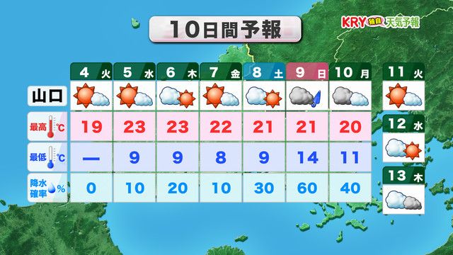 山口市内では日中の最高気温が19度。概ねこの時期らしい気温ですが、朝から15度以上上がり、きょう4日(火)は寒暖差が非常に大きくなります。体調を崩さないように、服装でうまく調節をして過ごしましょう。