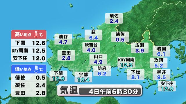 徳佐では0.5度まで気温が下がっています。その他、内陸や山間部を中心に気温は5度を下回っているところが多く、県内はフリースやコートも活躍するような今季一番の冷え込みとなっています。