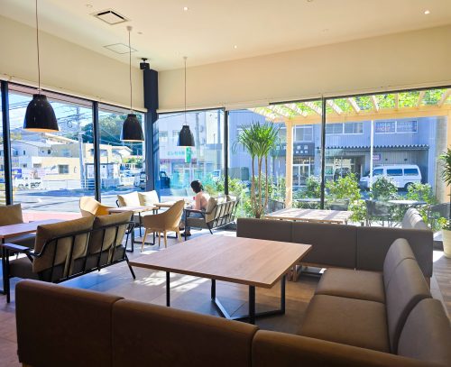 店内はガラス張りで明るく開放的。グリーンが配置され、心地よい雰囲気が広がっています。