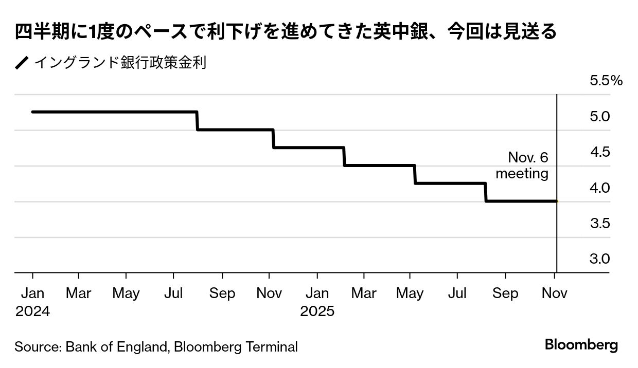 イングランド銀行(英中央銀行)は6日、政策金利を4.00%に据え置くと発表した。僅差の投票による決定は、12月の利下げに向けた布石となる可能性がある。