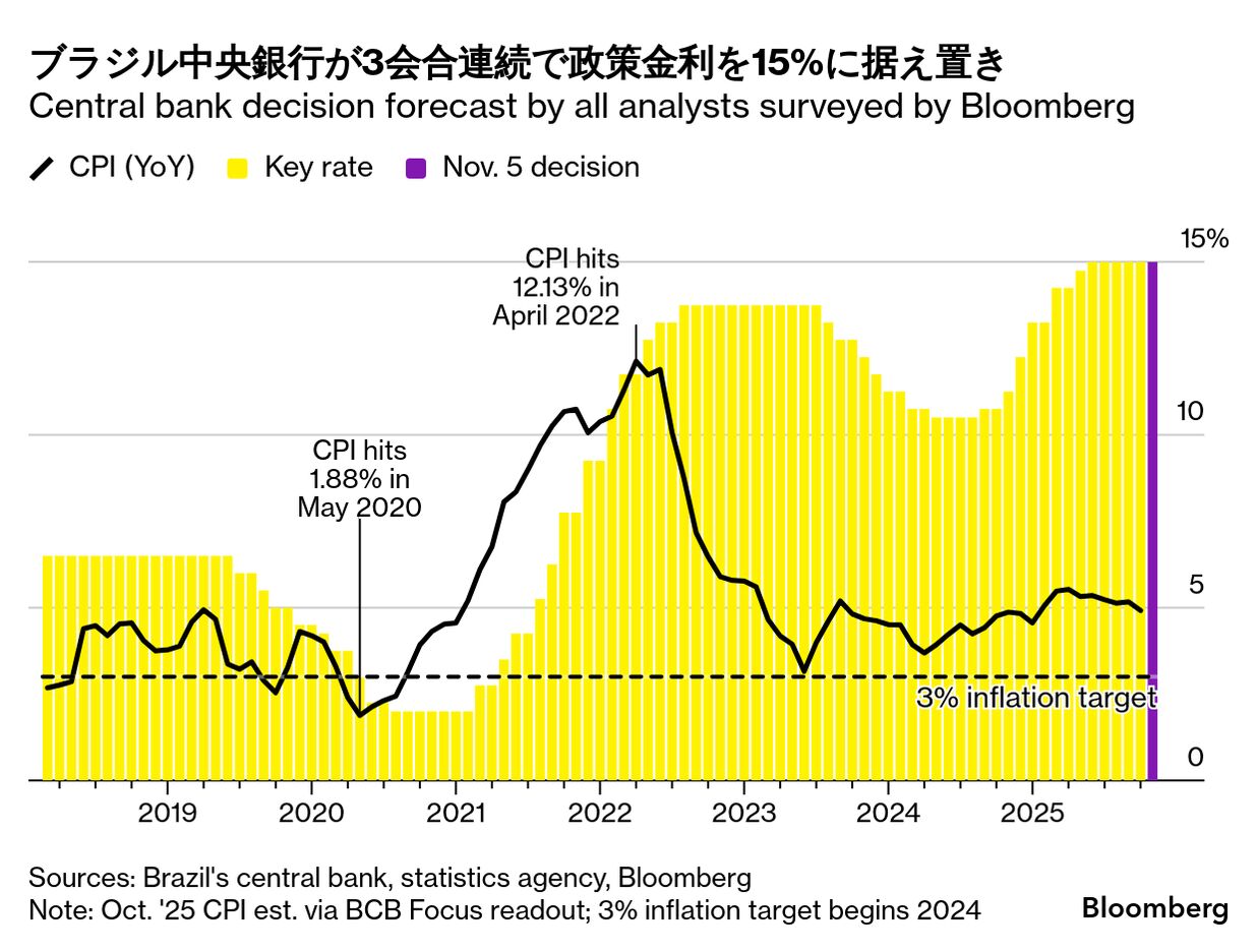 インフレ率は2028年まで3%の目標を上回り続けると予想される。失業率が記録的低水準にある現状やブラジルの不安定な財政への懸念の高まりが見通しを曇らせており、政策担当者らは警戒を崩していない。