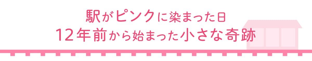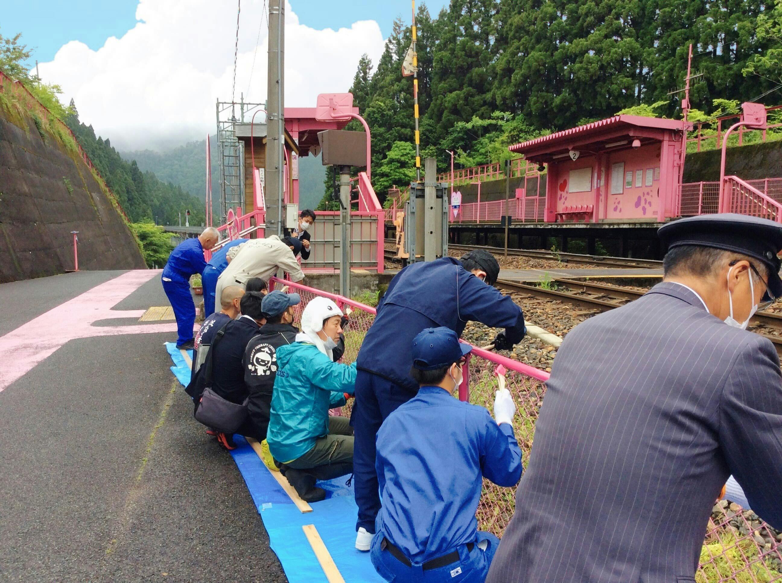 2013年、駅名標をハート型にリニューアルし、駅舎・フェンス・ベンチ・ゴミ箱まで、すべてをピンクに塗り替えました。