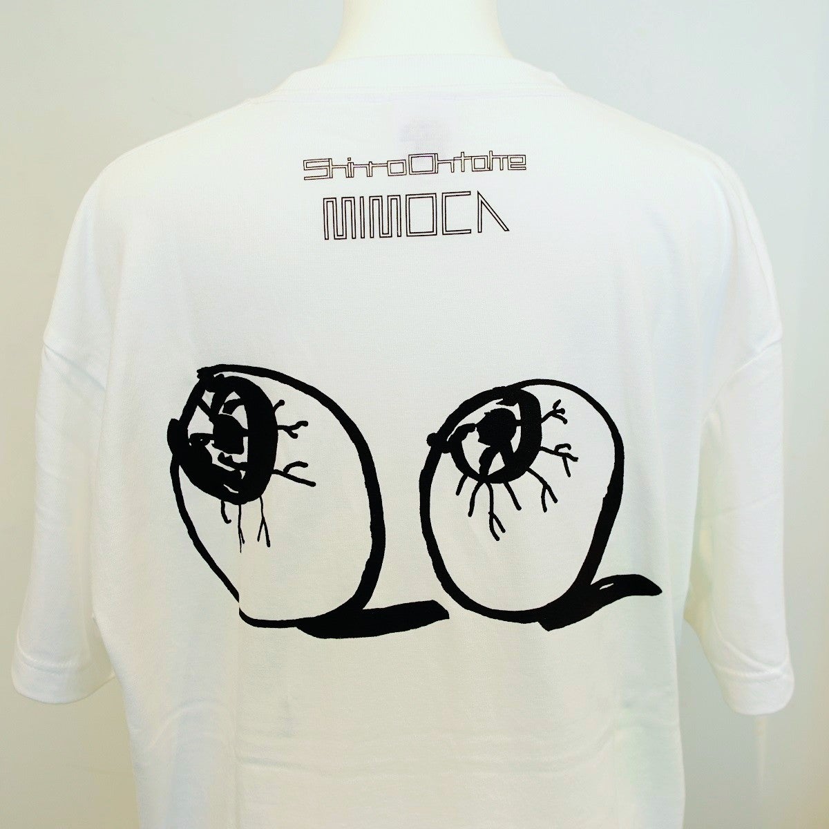 大竹さんのドローイングを再構成したTシャツです。「網膜」展なので、目は必然ですね。デザインの「RETINA」は網膜の英語表記です。ゲジゲジしてて思わず目を背ける人がいるかもしれません。下にいる目玉は鬼太郎の親父ではありません。黒デザインもありましたが、そちらには目の絵柄はありませんでした。