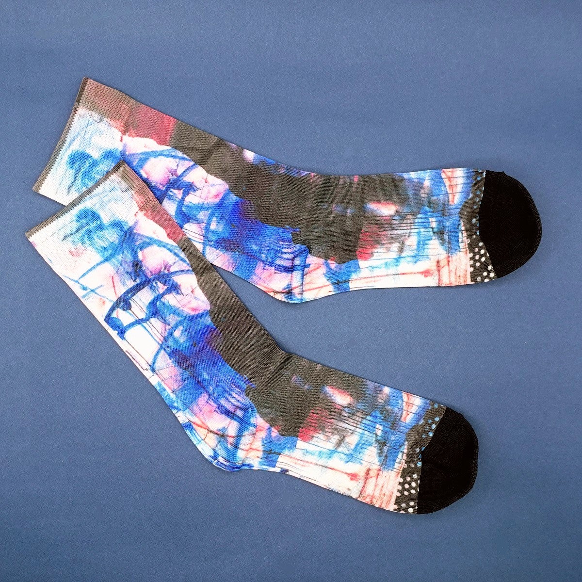 あたかも画家さんの作業用ソックスのようです。自分で色を追加しても大丈夫そうですね。親指がポッコリ顔を出しても、「そういうデザインだから」で通せそうな気がします。全部で3種類あって、どれも展示されている3作品を大胆にカットアウトしています。