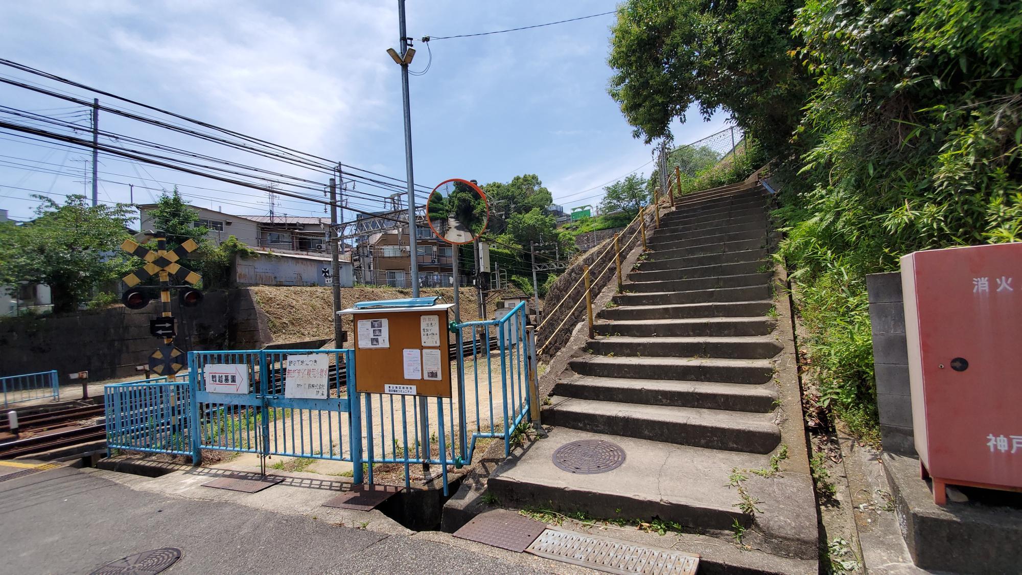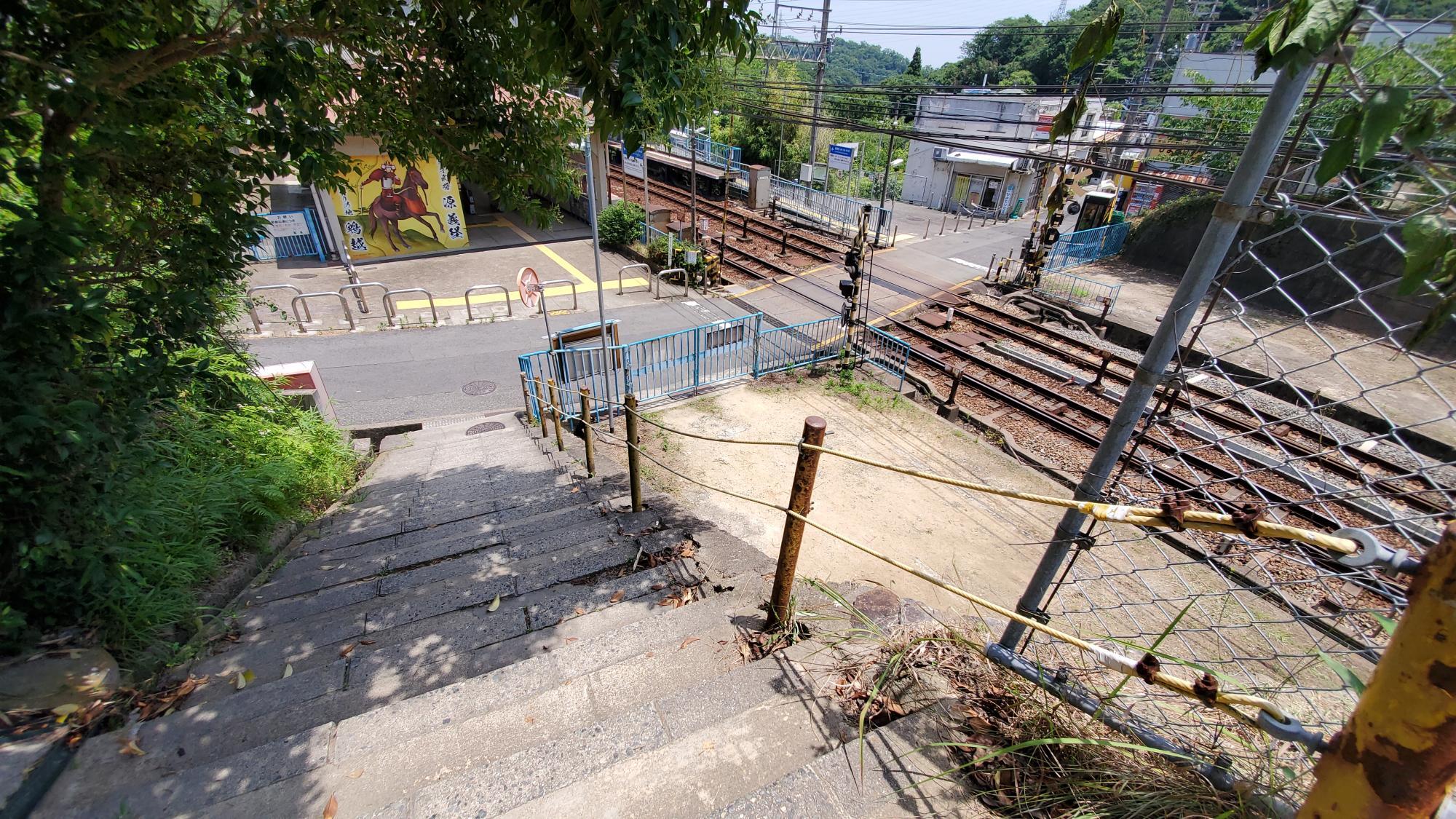 それもそのはず。駅はこの道からずっと下。崖を下りたところにあります。
