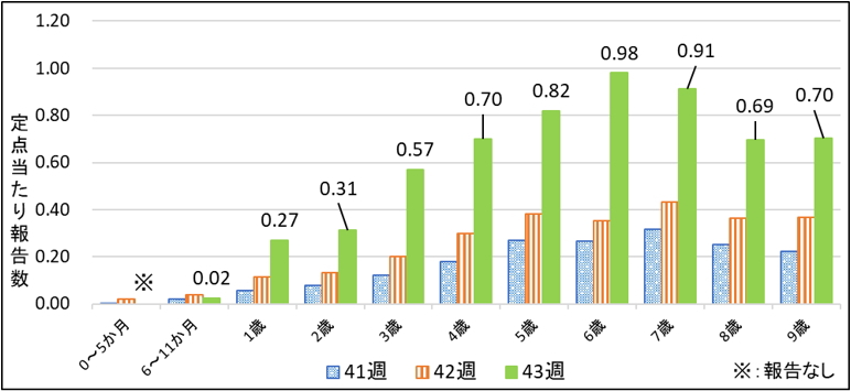 9歳以下で見ると、1歳未満を除いた全ての年齢で前週に比べて定点当たり報告数が増加しました。