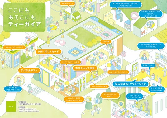 当社の事業が日常のさまざまな場面でお客さまのそばにあることを、街のイラストで表現した「ここにもあそこにもティーガイア」(P.5)や、業界シェア、販売拠点、お客さまとのつながりといった当社の強みを数値で示した「数字で見るティーガイアの強み」(P.7)など、当社の事業領域や価値を具体的に把握できるコンテンツも掲載。また、本レポートの表紙および本文中のイラストは、イラストレーターのたかなかなさんにご制作いただき、親しみやすく、視覚的にも理解しやすい構成となっています。