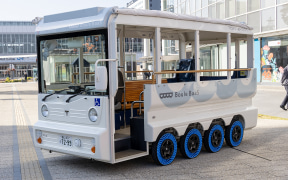 参加者によるあいさつの後はAirFreeを装着したブールバースが式場から乗客を乗せて運行開始。歩道に見えるがこのスペースは公園として整備されたところで、ブールバースは園内を走行する許可を受けている