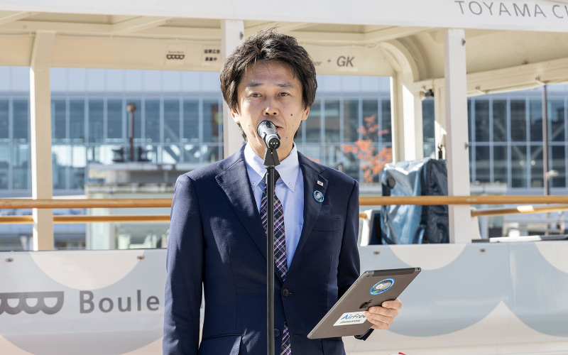 今回の出発式では運行前に関係者によるあいさつが行なわれた。最初に登壇したのは富山市市長 藤井裕久氏代理の富山市 活力都市創造部長の深山隆氏。
