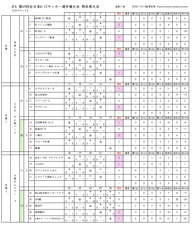 ※1-3回戦が引き分けの場合、PK 方式(3人制)で上位を決定する。