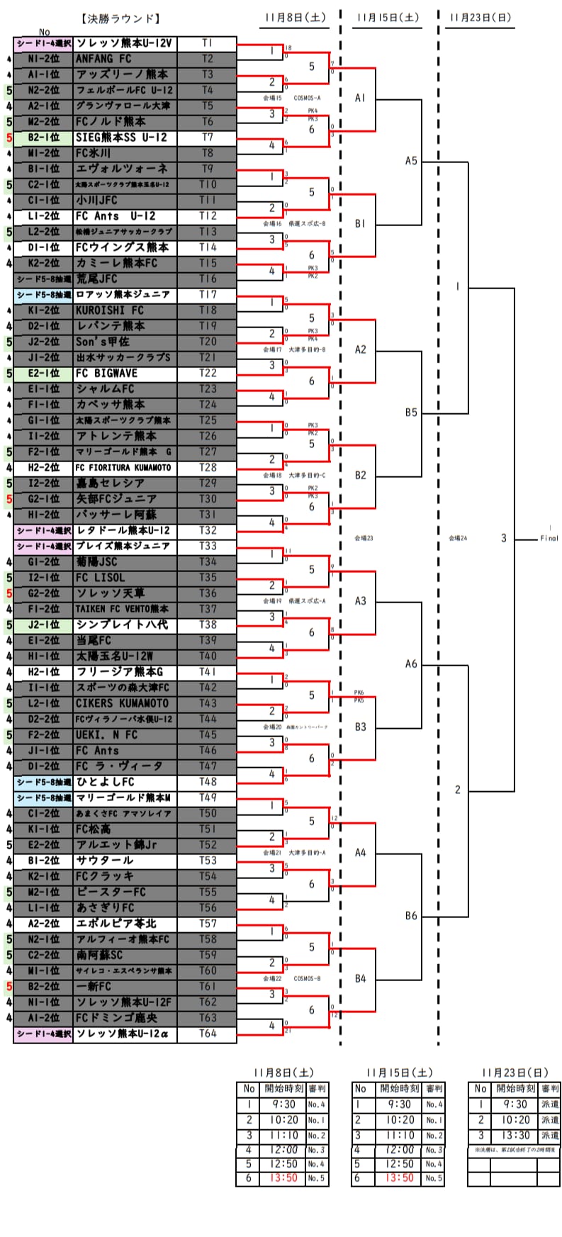 第1シード(ソレッソ熊本 U-12V)、第2シード(ブレイズ熊本ジュニア)、第3シード(ソレッソ熊本 U-12α)、第4シード(レタドール熊本 U-12)第5-8シード(荒尾 JFC/マリーゴールド熊本 M/ひとよし FC/ロアッソ熊本ジュニア)