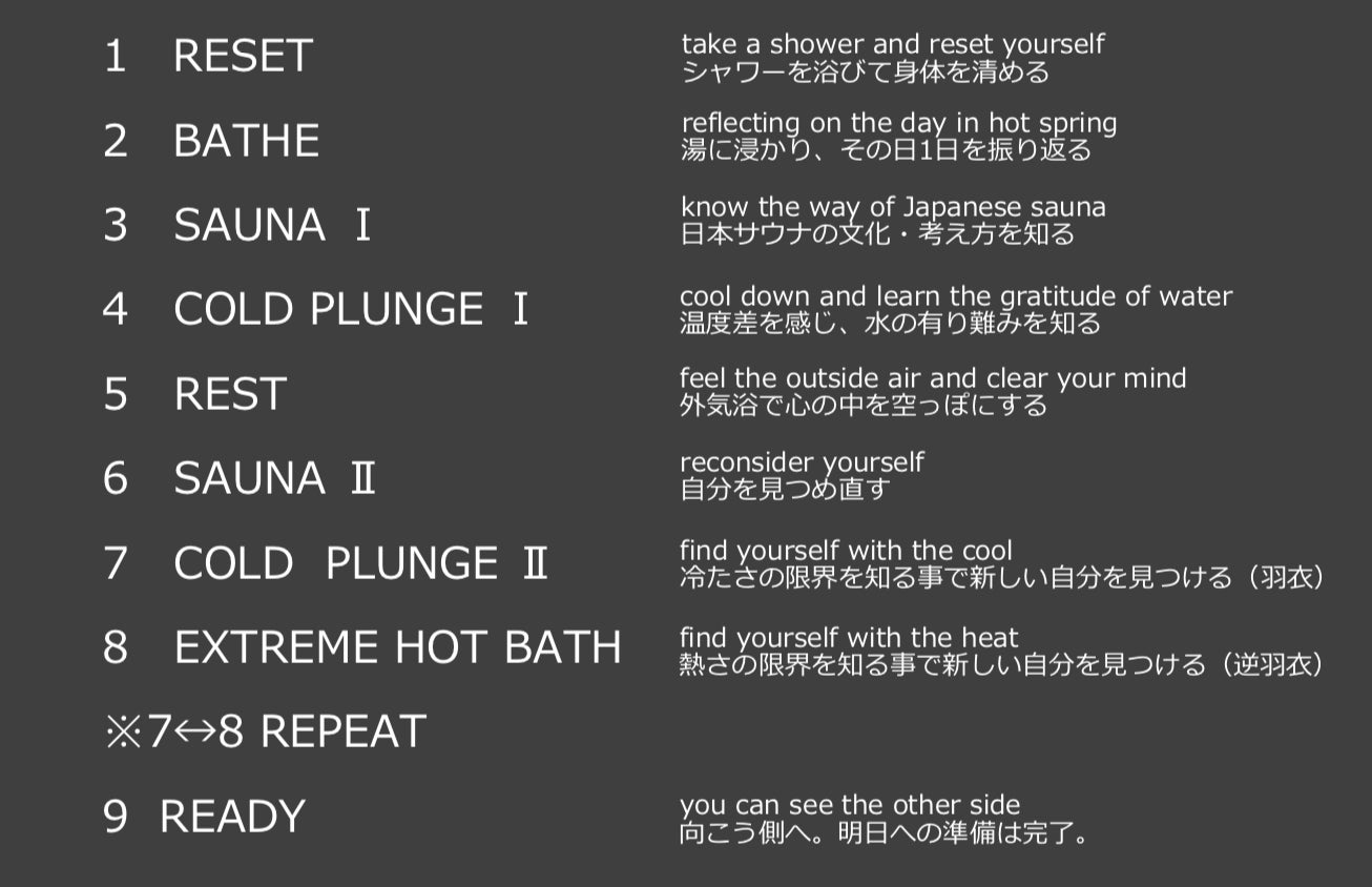 大阪の温浴文化として絶大なる人気を誇る、温冷交代浴をリチュアルとして再定義しました。”熱湯と水風呂を交互に入ること”がベースの入浴法となっておりますが、リチュアル1~6の流れで先に温度変化に慣らしたのち、交互浴を体験していただく流れを推奨しております。温冷交代浴により、気温変化に強い体へと仕上がり、”ととのう”とは異なる新感覚を楽しむことが可能となっております。