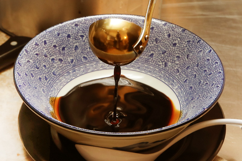 京都の老舗醤油製造所のたまり醤油を使用したかえし(たれ)に、北海道羅臼産昆布や国産舞茸を使用した鶏ガラスープを合わせた真っ黒のスープが自慢。