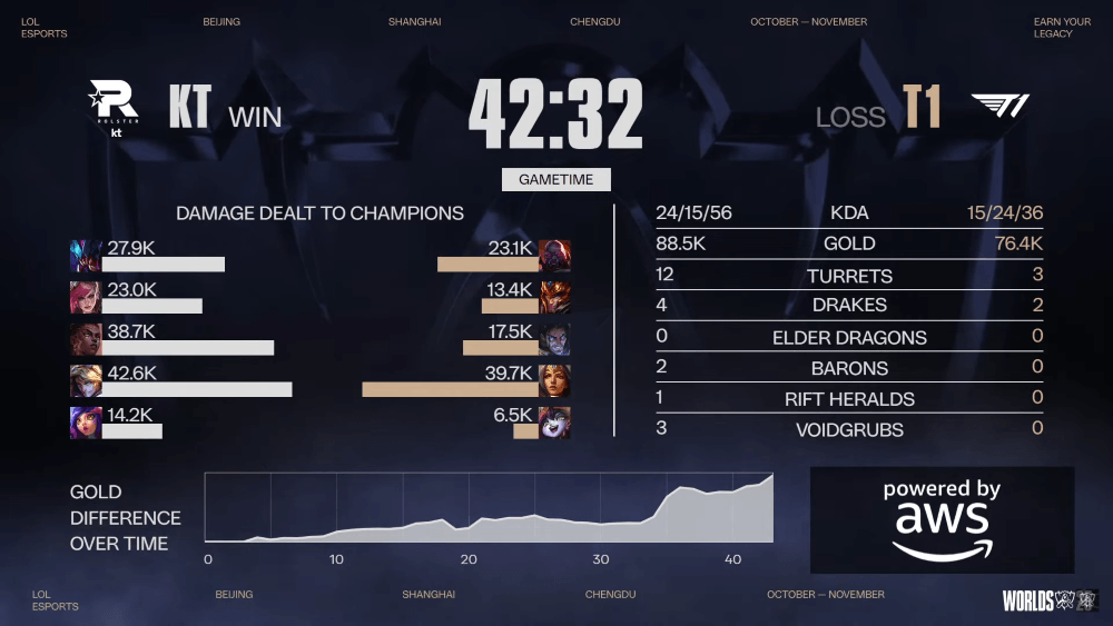 まさに圧巻の試合だった。グランドファイナルはBo5(3ゲーム先取)で行われたが、ゲーム1はT1が取ったものの、ゲーム2、ゲーム3でKTが勝利しリーチをかける。しかしここからT1が逆転を果たし、ゲーム4、ゲーム5を取り返して優勝を果たした。