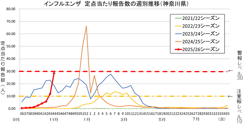 注意報レベルは定点当たり報告数10以上、警報レベルは30以上となっています。