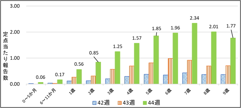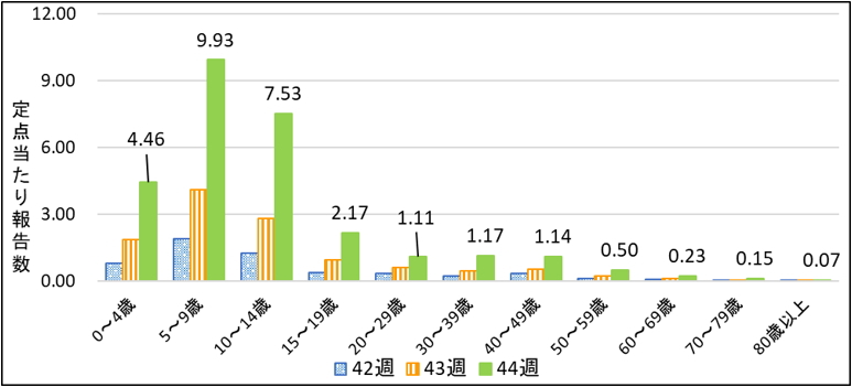 2025年第44週は、全ての年齢群で、前週に比べて定点当たり報告数が増加しました。