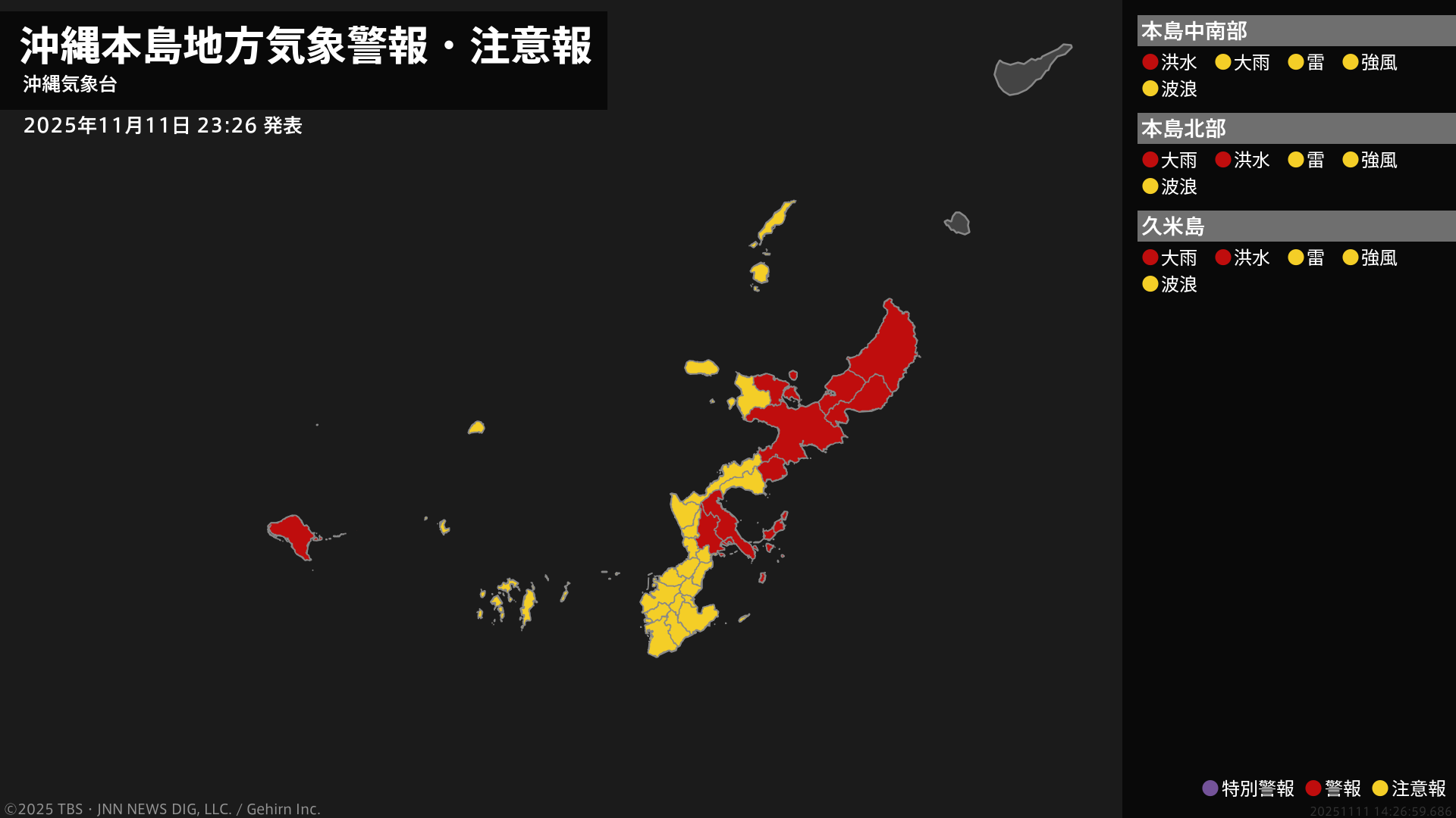 【大雨警報】沖縄県・久米島町に発表 11日23:26時点