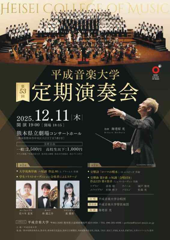 平成音楽大の学生や教員らによる年末恒例の演奏会。第1部は、ブラームス「大学祝典序曲」や、学内オーディションで選ばれた学生ソリスト3人が協奏曲でオーケストラと共演。第2部では、レスピーギの交響詩「ローマの噴水」、総勢300人が出演するベートーベン「第九」のステージを披露する。