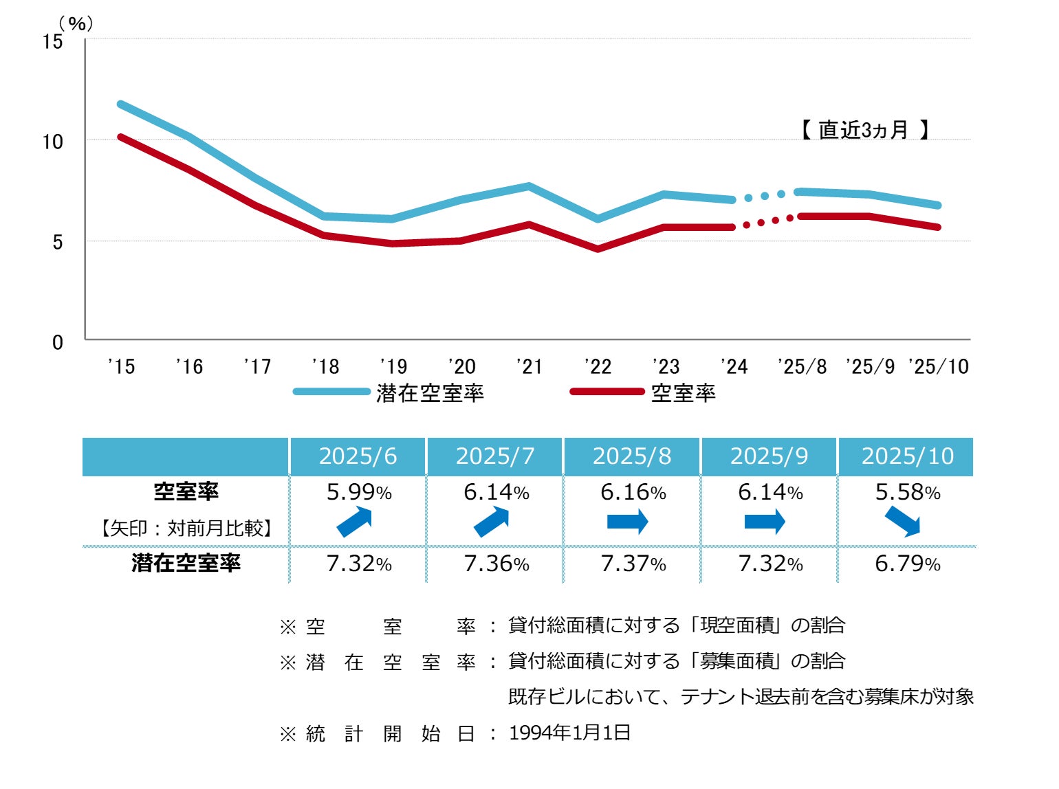 空室率は前月比マイナス0.56ポイントの5.58%となり、前月から大幅に低下した。主要エリアでの分室の開設や取壊し予定ビルでの外部募集の停止が主な低下要因となっている。規模別では「大規模」が前月比マイナス1.0ポイントの大幅な低下となった。潜在空室率は前月比マイナス0.53ポイントの6.79%だった。