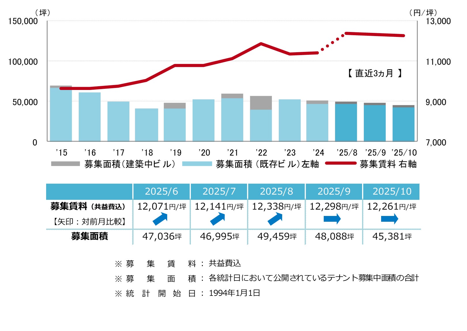 募集賃料 ほぼ横ばい 12,000円/坪台前半で推移