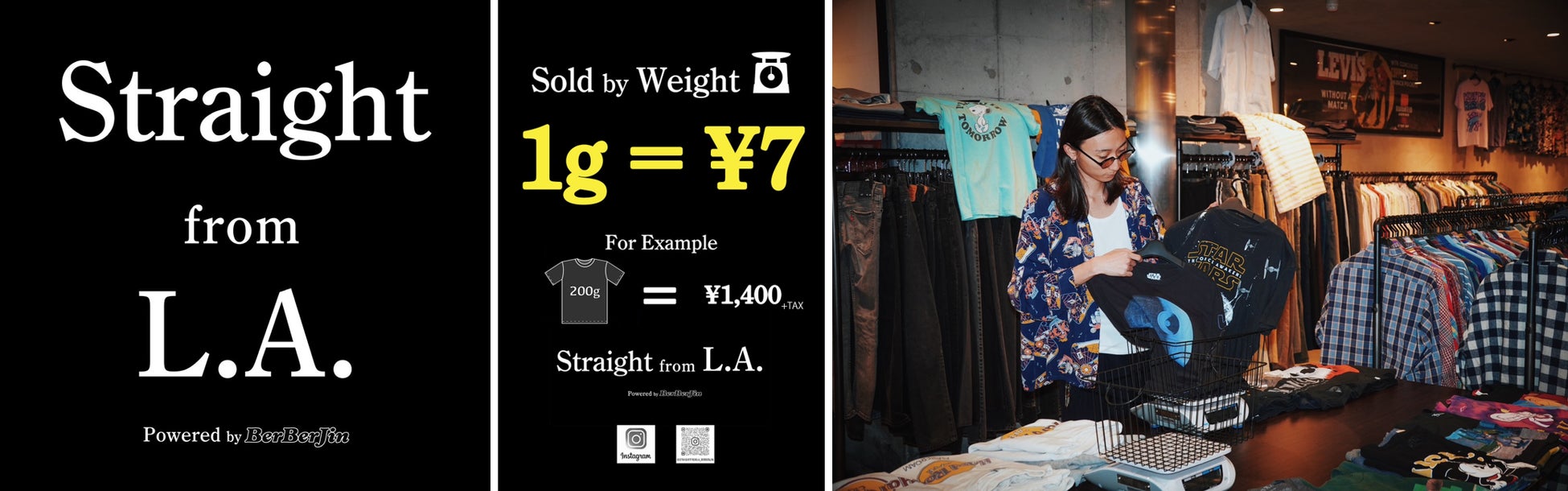 2024年よりBerBerJinが新たに展開する古着の量り売り業態「Straight From LA powered by berberjin」のPOP UP STOREをAPPLICATIONにて開催いたします。期間中、同店の商品を1gあたり7.7円(税込)で販売。Straight From LA powered by berberjinは、「ヴィンテージ市場が高騰している中でも、若者が古着を楽しんで買うことができる新たなエントランスになれば」という想いから始動。同店での古着との出会いをきっかけに系列店舗で取り扱うヴィンテージアイテムにも興味を持てるような機会創出を目指しています。POP UP STORE期間中、11月29日(土)・30日(日)には、東京から古着の知識に卓越したスタッフも来訪し、接客します。同業態では、初となるPOP UP STOREに是非ご来店ください。