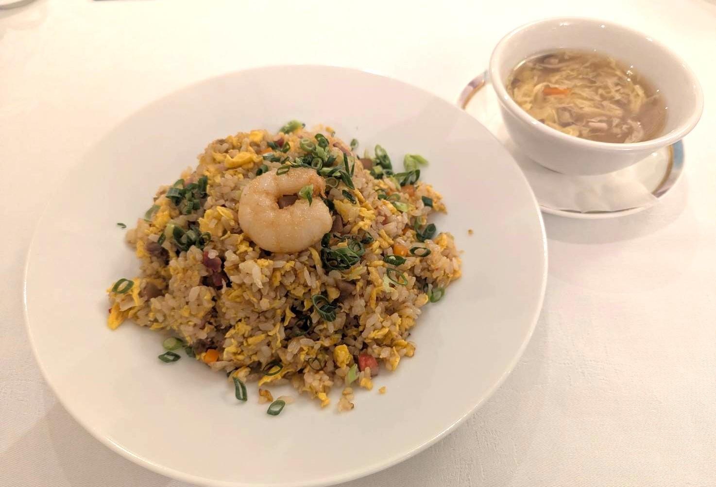 大きなエビの乗った「五目炒飯」は、口に入れた瞬間ふわっとほどける軽やかさ! パラリと仕上がったごはんは油っこさがなく、具だくさんの中にレンコンのシャキシャキ感がアクセント。これぞホテル中華…!と、うなってしまう上品な味わいです。