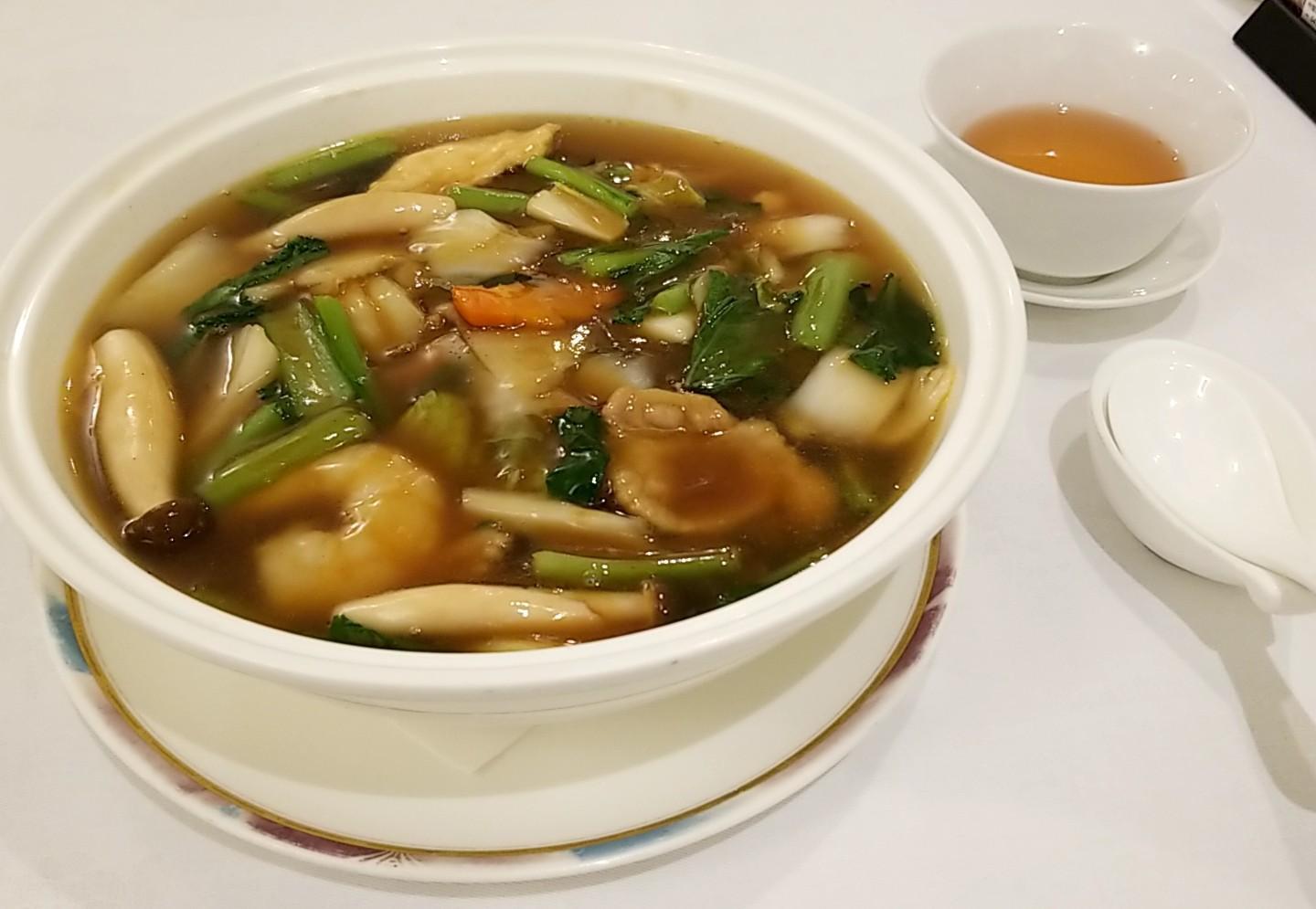 大きな器で提供される「五目あんかけそば」は、厚みのある豚肉が驚くほど柔らかく、野菜の食感と旨みを引き立てるとろみスープが絶妙なバランス。