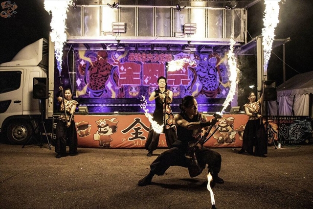 ステージではアイドル生ライブやファイヤーパフォーマンス集団「幻火」が出演し、夜まで熱気が続きます。