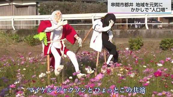 串間市都井地区に個性豊かな案山子
