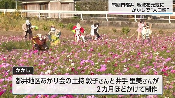 一方、串間市都井岬近くの国道448号沿いにある、都井地区あかり会が植えたコスモス畑には13体の個性豊かな案山子が登場した。