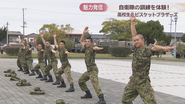参加した高校生とビスケットブラザーズは自衛隊が体力づくりのために行っている「自衛隊体操」などを体験しました。
