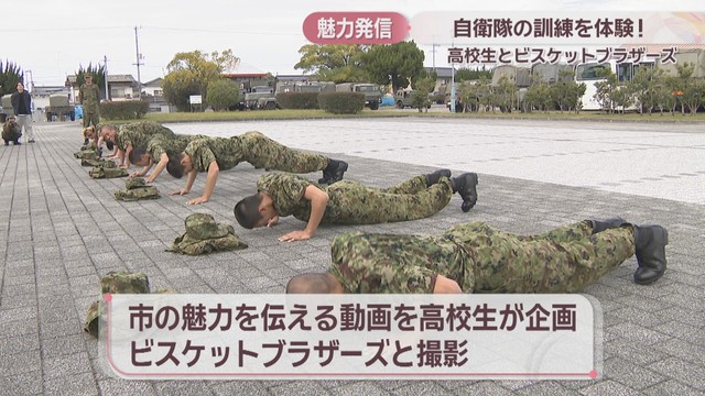 ビスケットブラザーズを起用し、善通寺市の魅力を伝える動画を高校生が企画しました。テーマは「自衛隊体験してみた」。善通寺市に駐屯地がある自衛隊の訓練を体験して動画で伝えることで地域の魅力を発信します。